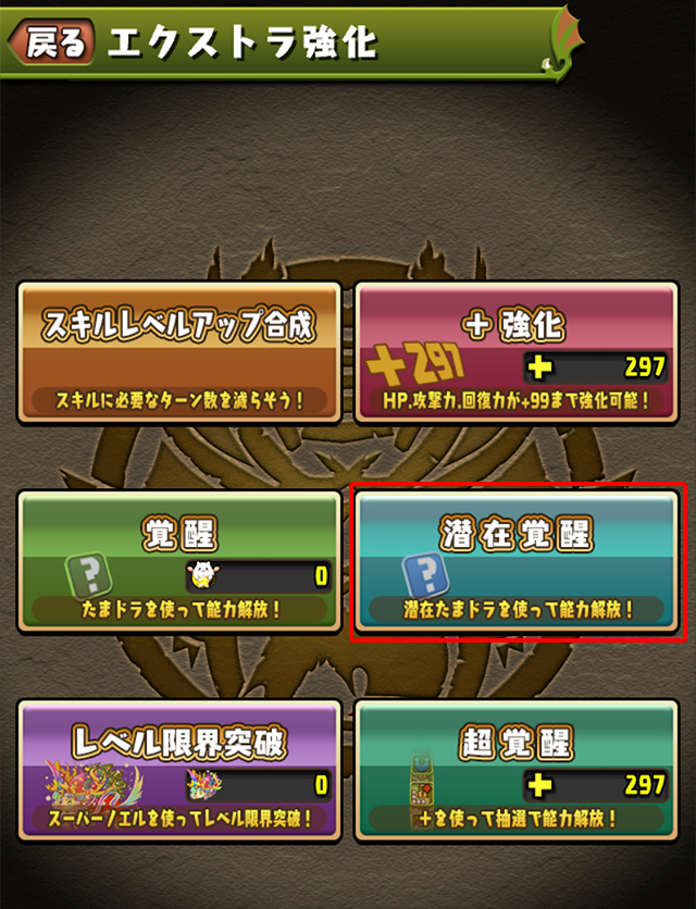 潜在覚醒スキル枠の解放は、「エクストラ強化」の「潜在覚醒」から行えます。