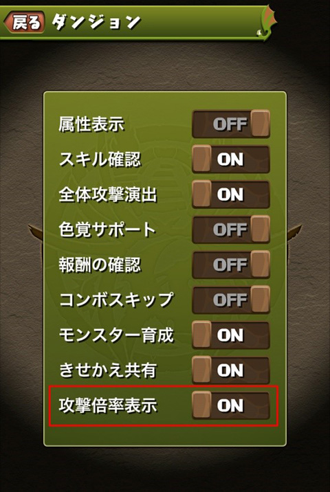 ※攻撃倍率表示は、 [その他]-[オプション] -[ダンジョン]内、「攻撃倍率表示」の設定を「ON」することで表示されます。